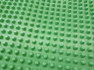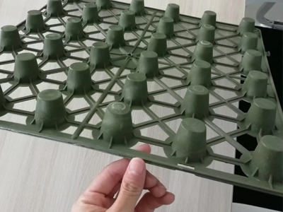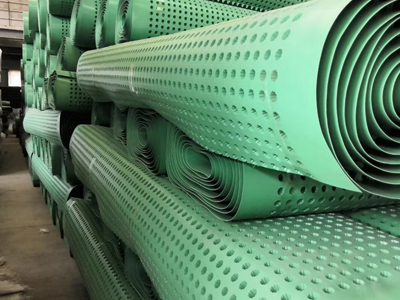 圓錐突臺(tái)的頂面膠接一層過(guò)濾土工布,以阻止泥土微粒通過(guò),從而避免排水通道阻塞使孔道排水順暢。 傳統(tǒng)的排水方式使用磚石瓦塊作為導(dǎo)濾層、使用較多的鵝卵石或碎石作為濾水層、將水排到指定地點(diǎn)。而用排水板取代鵝卵石濾水層來(lái)排水則省時(shí)、省力又節(jié)能、節(jié)省投資、還能降低建筑物的荷載。